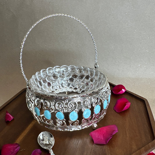 Turquoise Enamel Silver Basket with Handle & Removable Glass Bowl - Satin Lined Box