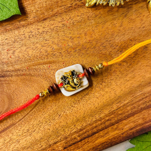 Golden Ganeshji On Off White Beads Rakhi - Single