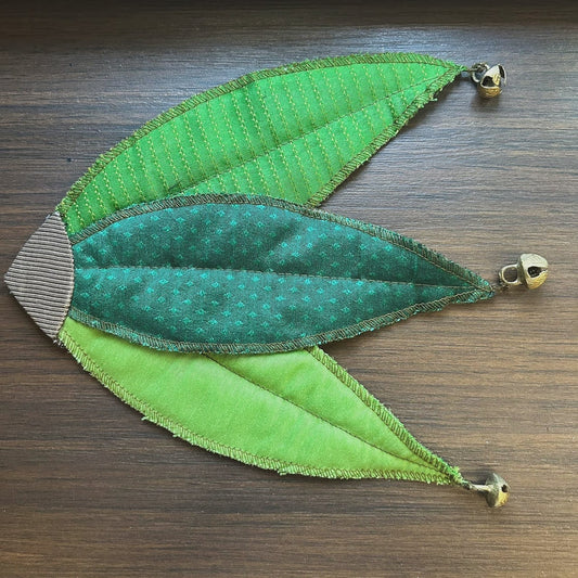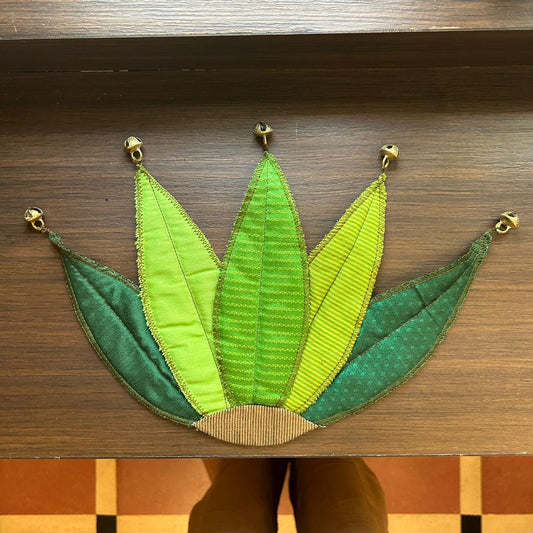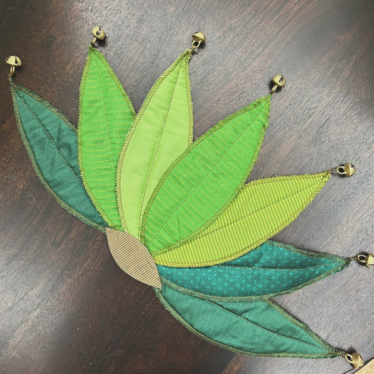Elegant 7 Green Leaf Brocade Fabric Placemats with Bells Accents - Perfect for Festive Decor