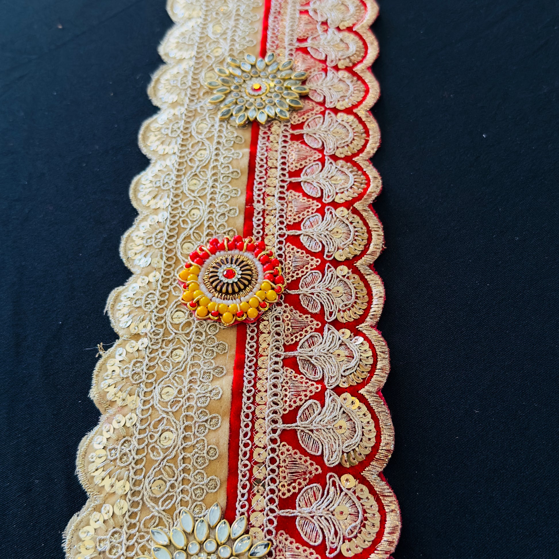 Welcome prosperity and style into your home with this 40-inch handcrafted Red & Gold Bandhanwar (door toran). Designed with intricate lacework, scalloped embroidery, sequins, and kundan-style floral embellishments, this toran is the perfect way to enhance your entrance during Diwali, weddings, Navratri, Ganesh Chaturthi, and housewarmings.