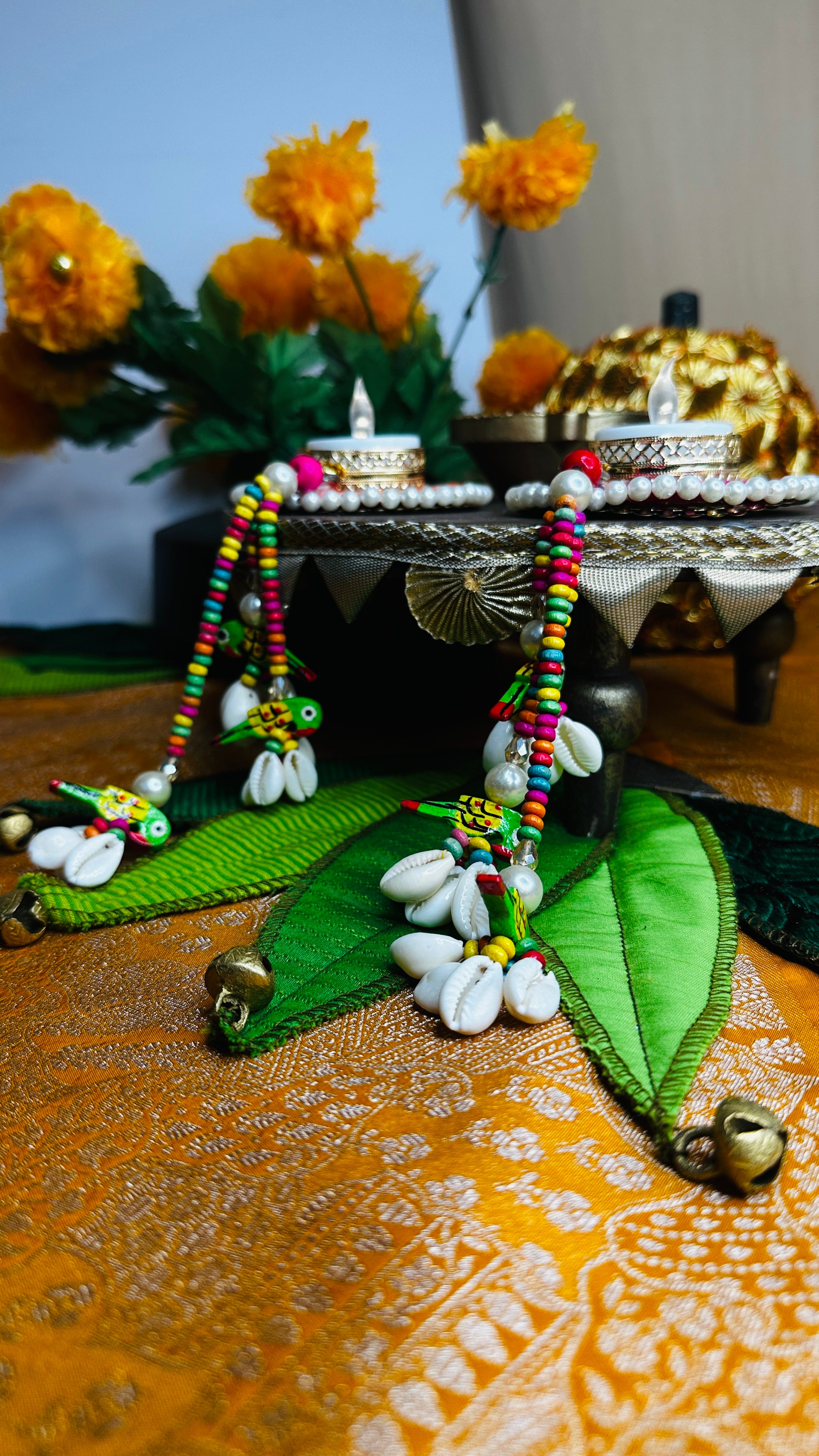 These handcrafted Parrot Latkan Pearl Diyas bring life, color, and culture into every nook of your home. Decorated with pearls, cowrie shells, and hand-painted parrot latkans, each piece is designed to spread joy and warmth while keeping tradition alive.